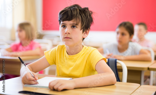 Schoolchildren studying in classroom during lesson. Boy sitting in foreground.