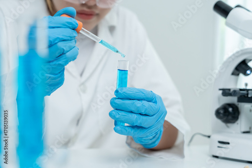 Scientist analyze biochemical samples in advanced scientific laboratory. Medical professional use dropper mix microbiological developmental of viral. Biotechnology research in science lab. cosmetic