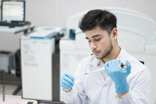 Scientist hand holding and using pipette drop reagent for blood chemical analysis.Laboratory equipment and medical treatment concept.Young man researcher in the his lab room.