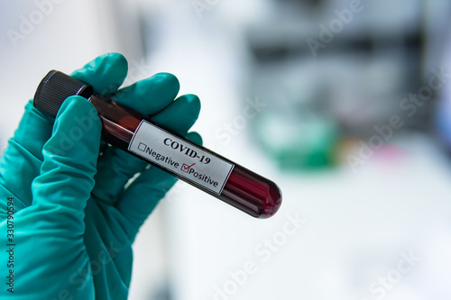 Scientist holding Test tube with blood sample for COVID-19 test,Experiment to detect virus was found in the blood.