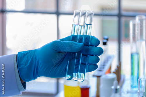 Scientists hold the chemical tubes to test values. scientist concept