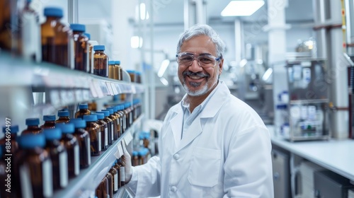 Scientists in a vertical pharmaceutical factory work on experimental plant processes. A doctor doing research in the pharmaceutical industry looked up and smiled.