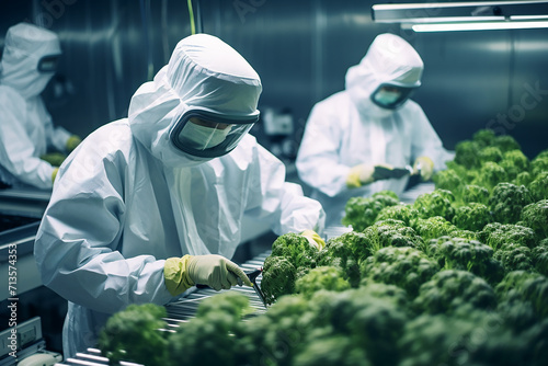 scientists in hazmat suits analyzing green vegetables in hydroponic factory