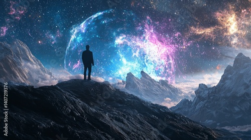 Sci-Fi Landscape with Cosmic Elements and Silhouette of a Figure