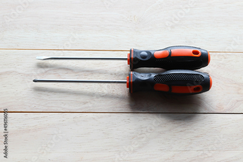 Screwdriver equipment tools rubber handle for repair and maintenance on wooden background closeup.
