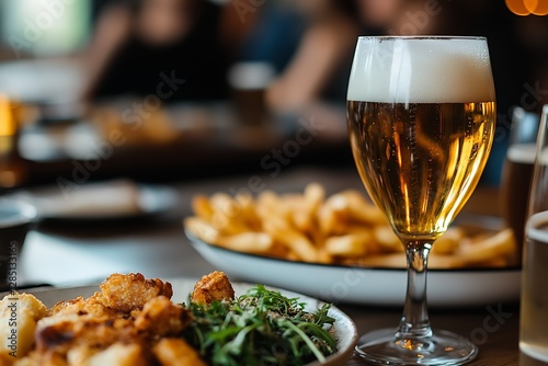 Scrumptious fried dishes served with a chilled glass of beer in a lively dining setting : Generative AI