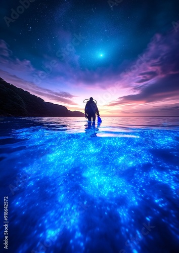 Scuba Diver Exploring Bioluminescent Waters at Twilight with Starry Sky