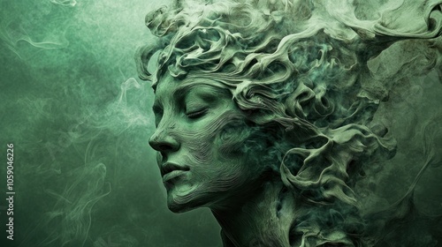 woman, sculpture, smoke, green, art, fantasy, abstract, portrait, mystical, digital, artistic, dreamy, figurative, creative, head, face, eye, closed, human, female, surreal, hallucinogen, artwork, concept, imagination, design, illustration, image, graphic, photo, photo, modern, contemporary, style, shape, form, colours
