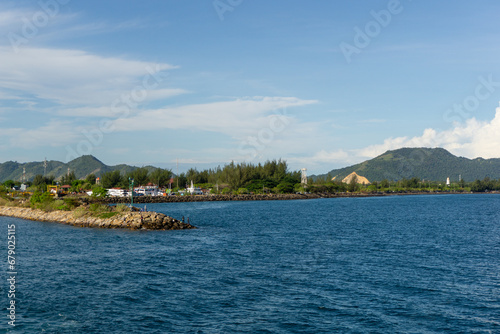 Sea stones breakwater and lighthouse in Ulee Lheue harbor in Banda Aceh, Indonesia. Beautiful ocean view