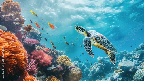 Sea Turtle Gracefully Swimming in Vibrant Coral Reef