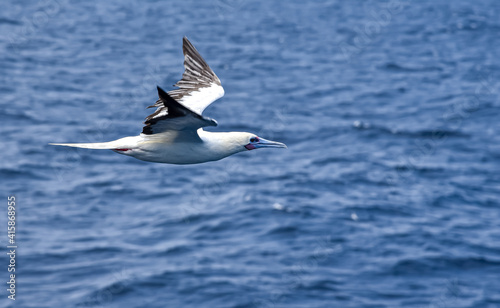 Seabird Masked, Blue-faced Booby (Sula dactylatra) flying over the blue ocean. Seabird is hunting for flying fish jumping out of the water.