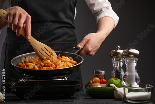 Seafood, Chef fries shrimp with vegetables on a gray background with space