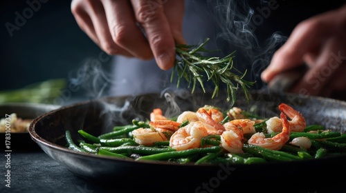 Seafood, Professional cook prepares shrimps with sprigg beans. Cooking seafood, healthy vegetarian food and food on a dark background. Horizontal view. Eastern kitchen