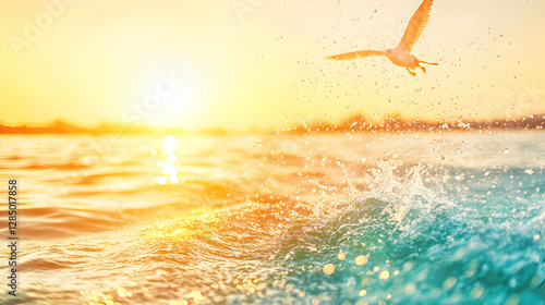 seagull, sunset, ocean, wave, flight, splash, water, bird, sun, sky, nature, beach, sea, coast, summer, freedom, travel, wildlife, animal, landscape, background, beautiful, gold, light, horizon, scene, view, calmness, peaceful, serenity, calm, majestic, wingspan, soaring, aquatic, marin, outdoors, scenic, photo, image, picture, graphic, element, design