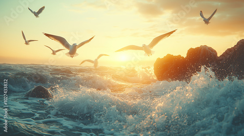 seagulls flying gracefully over ocean waves at sunset, radiating tranquility and freedom