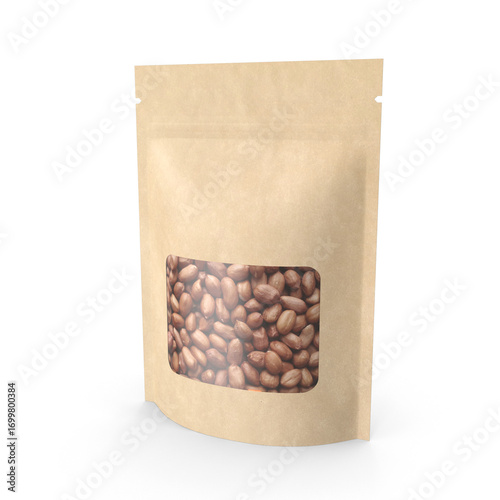 Sealed kraft paper pouch packaging mockup with clear window isolated background
