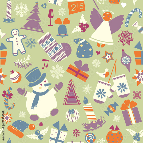 Seamless cartoon christmas pattern on a green background. Wallpaper with new year elements.
