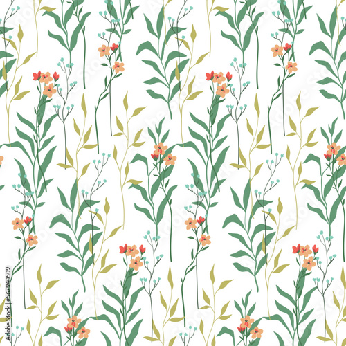Seamless floral pattern, delicate flower print with spring botany. Beautiful botanical design with hand drawn wild plants: small flowers, leaves, branches on a white background. Vector illustration.