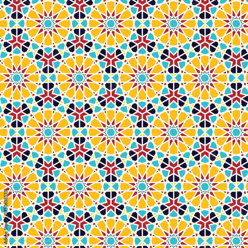 Seamless Islamic geometric pattern with traditional arabesque ornament, colorful oriental mosaic background for Ramadan and Eid
