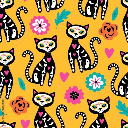 seamless, pattern, background, day of the dead, mexican, mexico, cute, print, cat, skull, skeleton, halloween, flower, celebration, holiday, decor, vector, element, design, card, greeting, childish, wallpaper, wrapping paper, textile, apparel, cartoon