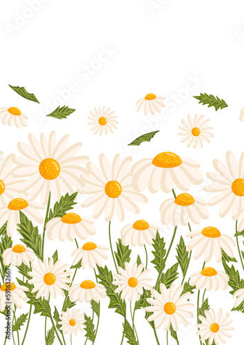 Seamless pattern for postcard or poster with daisies. Chamomile vector floral illustration for congratulations or decor etc. Flowers for spring and summer holidays. Festive template can add text.