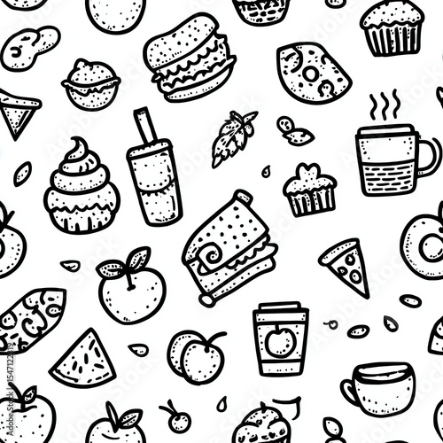 seamless pattern of cute food doodles in black and white, featuring pizza slices, burgers, donuts, coffee cups, cupcakes, fruits