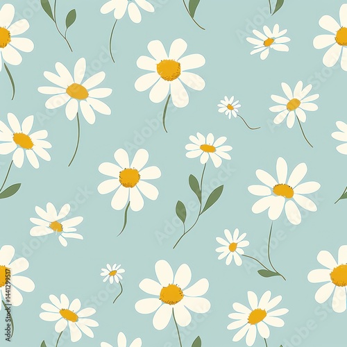 Seamless pattern of white daisies with yellow centers and green leaves on a soft blue background, evoking a cheerful and fresh springtime feeling
