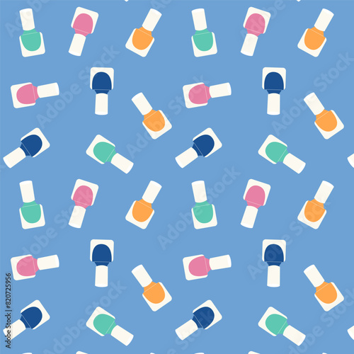 Seamless pattern with bottles of nail polishes of different colors.