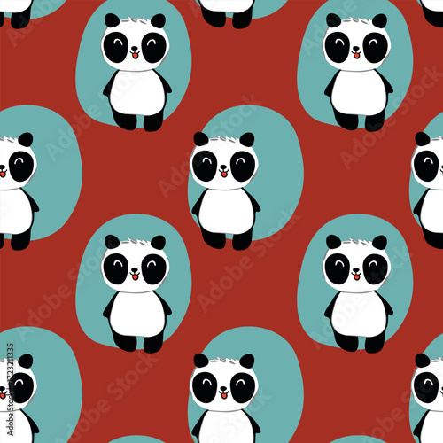 Seamless pattern with cute panda baby on color background. Funny asian animals. Card, postcards for kids. Flat vector illustration for fabric, textile, wallpaper, poster, gift wrapping paper.