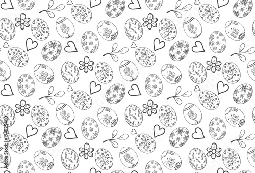 Seamless pattern with eggs, hearts, flowers and leaves.
