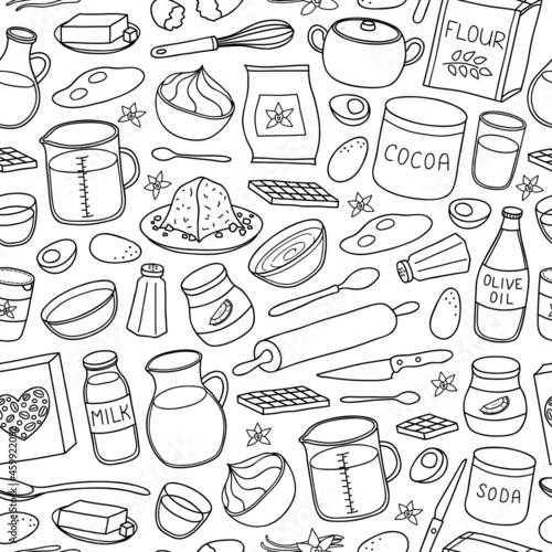seamless, pattern, kitchen, meal, ingredient, flour, pastry, vector, bowl, sugar, menu, cookery, bake, product, food, salt, cooking, water, white, print, eat, culinary, receipe, background, egg, baking, milk, butter, cocoa, doodle, hand-drawn, outline, yogurt, oil, cheese, package, glasses, bottle, carafe, oiler, powder, soda, vanilla, knife, whipped, spoon, rolling, pin
