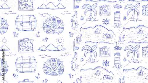 Seamless pattern with hand drawn travel elements like treasure chest and tropical island landscapes theme design silhouette