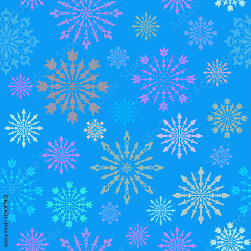 Seamless pattern with large and small colorful carved snowflakes on white background