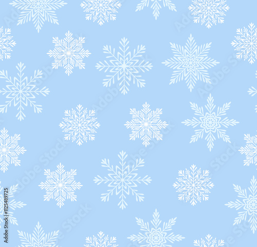 Seamless pattern with snowflakes in cartoon style. Vector illustration of beautiful snowflakes of different shapes and sizes, isolated on light blue background. Wrapping paper. Packaging. Holiday.
