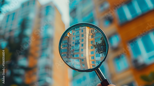 Searching new house for purchase. Rental housing market. Magnifying glass near residential building