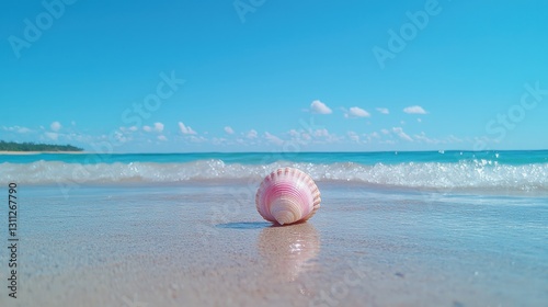 Seashell on a pristine beach with gentle waves under a vibrant blue sky.