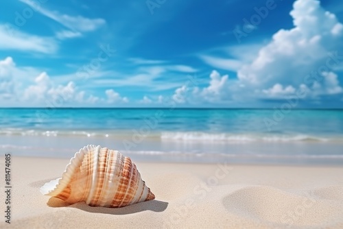 Seashell Resting on Sandy Beach with Azure Sky and Sea Background