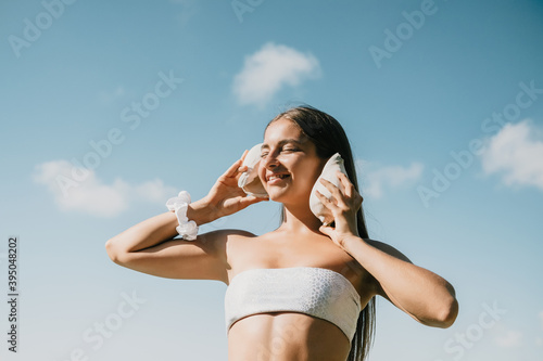 person, young, natural, background, skin, face, sunshine, bikini, sunlight, summer, smile, young adult, white, relaxation, hair, relax, 1, sunny, sky, freedom, hearing, hand, blue, travel, holiday, lifestyle, listen, beautiful, girl, happy, outdoors, sound, seashell, summer, portrait, female, shell, woman, sea, vacation, beach, beauty, people