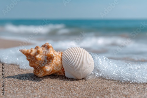 seashell, sand, wave, rest, lap, shine, soft, relaxing, calm, sunny, bright, peaceful, beach, shore, coast, ocean, vacation, travel, decoration, background, still life, nature, calmness, conch, sea foam, sea, water, daylight, summer, holiday, seacoast, maritime, marin, texture, wall, poster, collage, image, website, element, advertisement