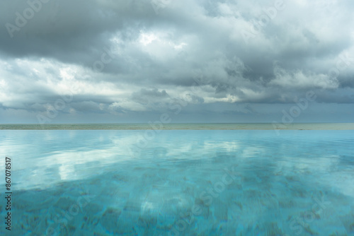 Seaside swimming pool with clouds in the sky and reflections on the water in the morning