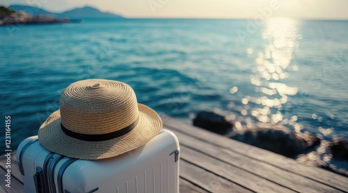 Seaside Vacation with Straw Hat on White Luggage by Calm Water