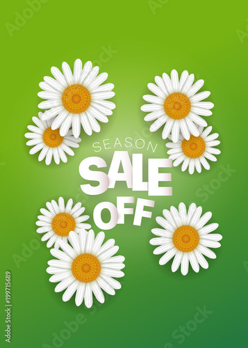Season sale offer. Season sale vector banner with white camomile. Vertical composition