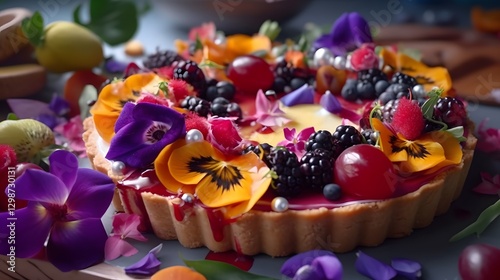 tart, fruit, mango, peach, dragon, cream, vanilla, buttery, flaky, dessert, colours, texture, culinary, epicure, seasonal, sweet, delight, treat, artistry, inviting, natural, elegance, light, edible, flower, creativity