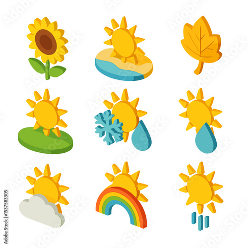 seasonal, sun, icon, isometric, flat, icon, set, spring, sunflower, summer, beach, autumn, leaf, glow, winter, low, snowflake, raindrop, cloud, rainbow, frost, all, grid, per