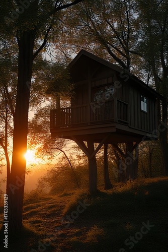 treehouse, sunset, forest, wood, tree, golden hour, cabin, wooden, balcony, tranquil, peaceful, nature, landscape, idylli, evening, sunlight, escape, adventure, dream, childhood, serenity, whimsical, rustic, home, shelter, secluded, magical, warm light, digital artwork, illustration