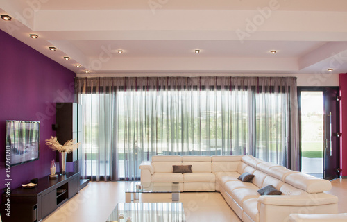 sofa, luxury, modern, living room, absence, copy space, day, design, door, indoor, interior, no people, nobody, purple, showcase, table, technology, television, wall, window