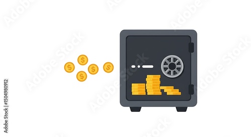 safe, coin, money, security, storage, finance, investment, bank, stack, wealth, gold, saving, deposit, protection, financial, currency, illustration, vector, isolated, symbol, concept, flat, metallic, grey, gold, secure, economy, business, treasure, metal, lock, combination, open, earn, growth, banking, cash, asset, capital, value, pay, white background, nobody, wealthy, abundance, accounting, invest