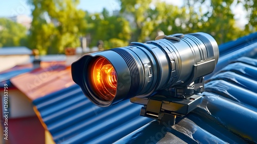 security camera, telephoto lens, camcorder, city view, city landscape, technology, safety, protection, monitoring, security equipment, lens flare