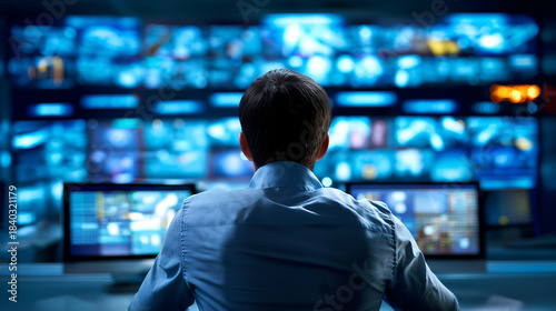 Security operations center with lone faceless figure in darkened control room overseeing wall of monitors displaying live feeds, symbolizing vigilance data security technological p