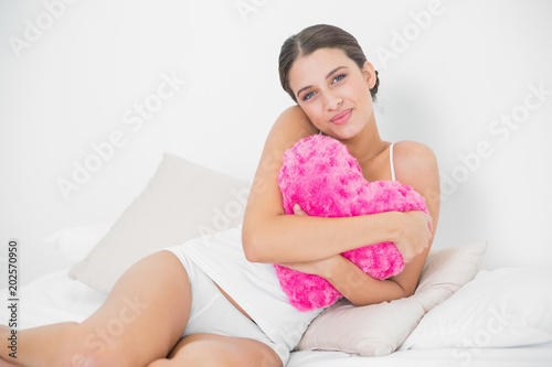 Seductive young brown haired model in white pajamas hugging a heartshaped pillow